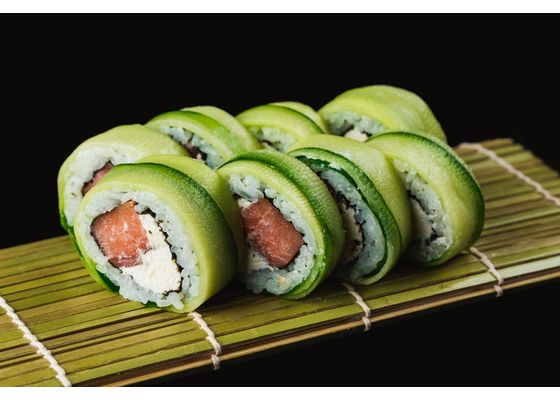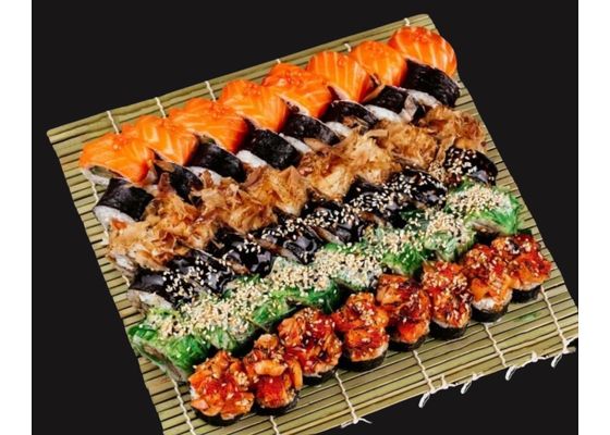 Грин ролл, ролл Фудзи, ролл Бонито, ролл с угрем и огурцом, ролл с лососем и сливочным сыром, ролл Филадельфия Роял (48 штук)