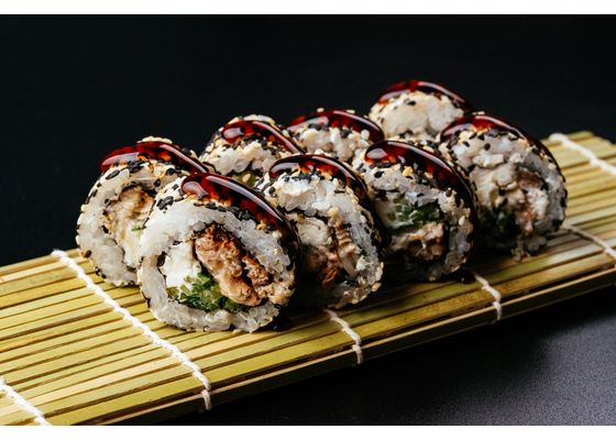 Рис, нори, копченый угорь, сливочный сыр, соус унаги, огурец, кунжутная смесь