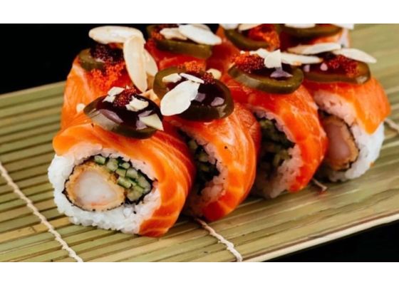 Рис, нори, тигровая креветка, соус с икрой трески, лосось, халапеньо, огурец, миндальная стружка, соус ХЗ, икра тобико