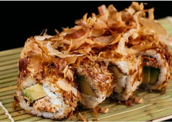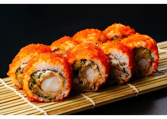Рис, нори, тигровая креветка в темпуре, огурец, сливочный сыр, икра тобико