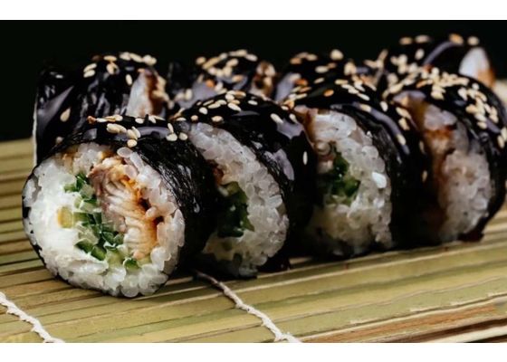 Рис, нори, копченый угорь, огурец, соус унаги, кунжутная смесь
