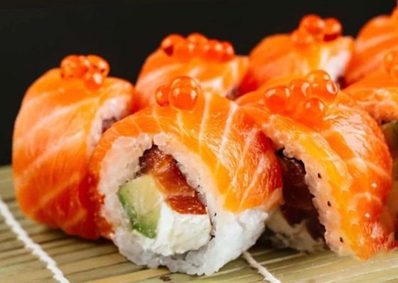 Рис, нори, сливочный сыр, лосось, икра лососевая, авокадо