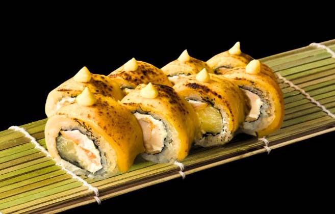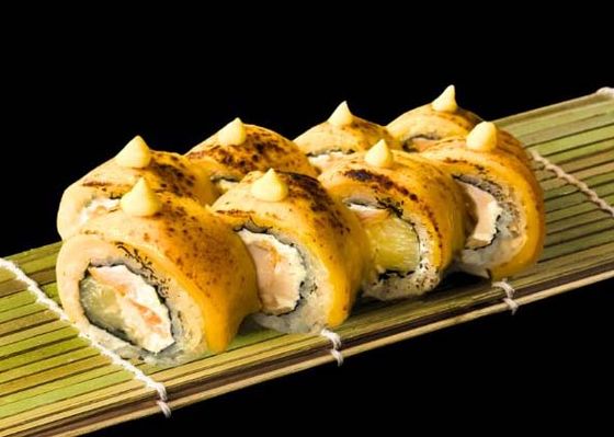 Рис, нори, тигровая креветка в темпуре, огурец, сливочный сыр, икра тобико