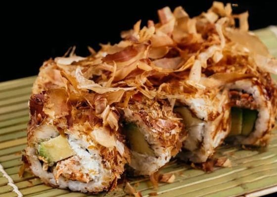 Рис, нори, тигровая креветка в темпуре, огурец, сливочный сыр, икра тобико