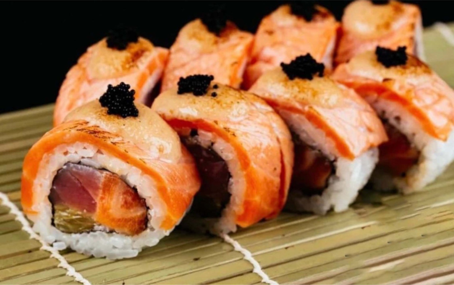 Рис, нори, лосось, тунец, апельсин, соус шрирача, соус с икрой трески, икра тобико