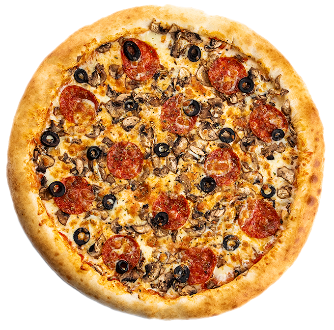 Томатный соус, сыр моцарелла, пепперони, шампиньоны, маслины, смесь итальянских трав