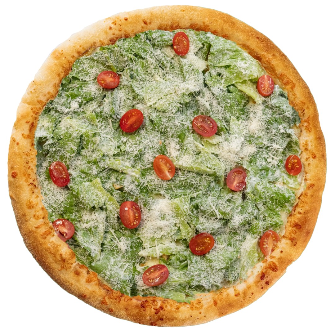 Белый соус, грудинка свиная, цыпленок запеченный, томаты, листья салата, сыр моцарелла, сыр пармезан, соус цезарь, томаты черри, смесь итальянских трав