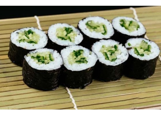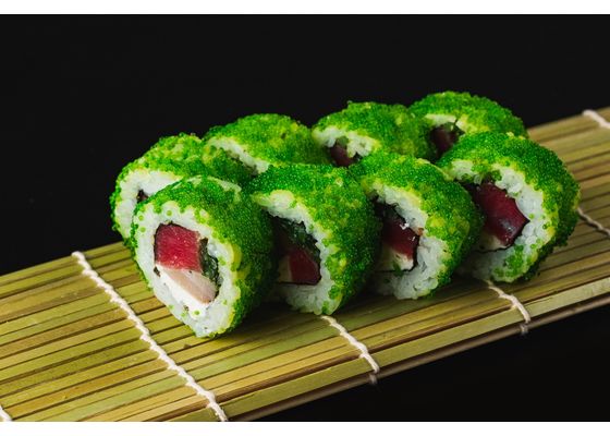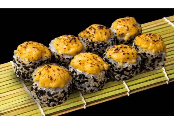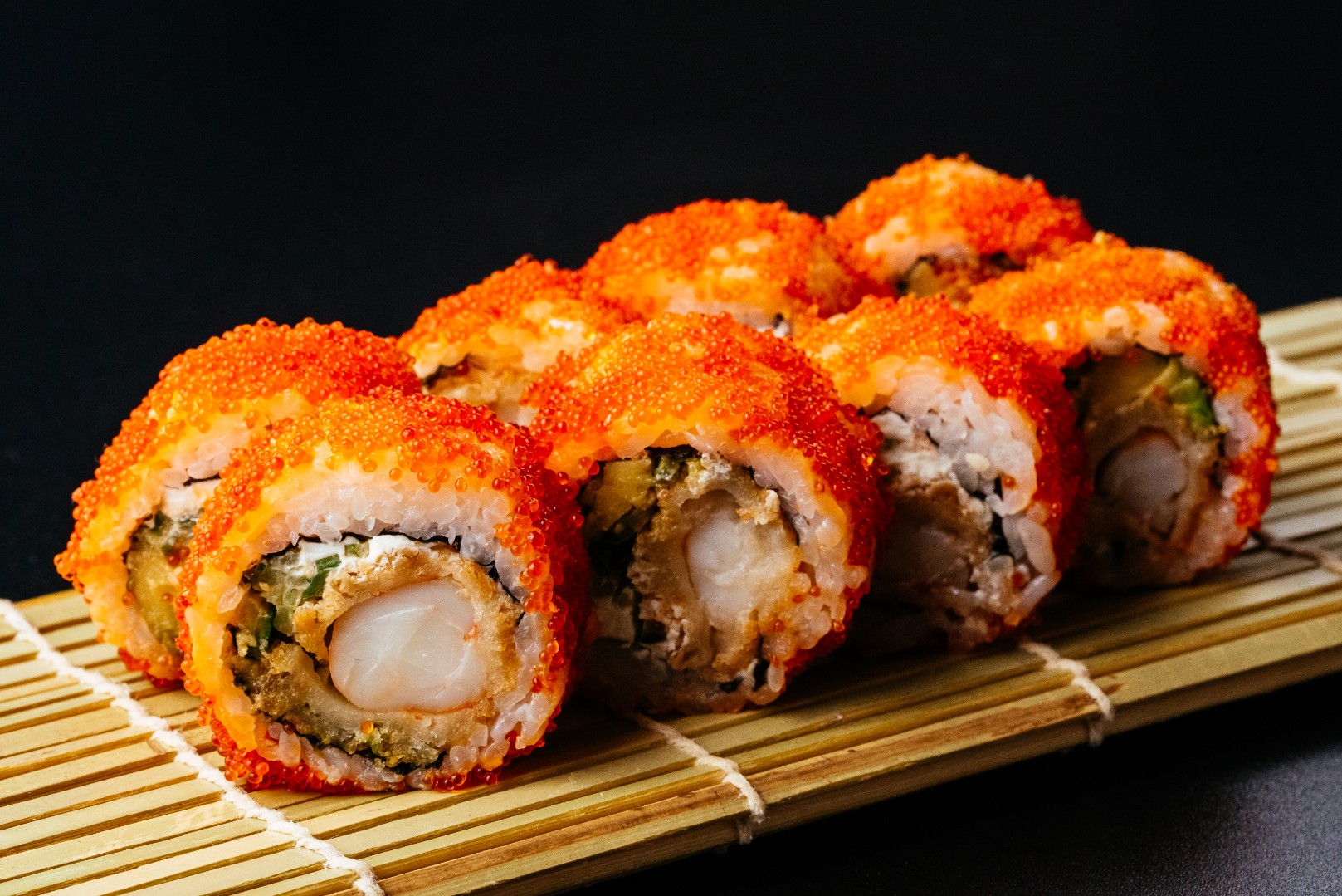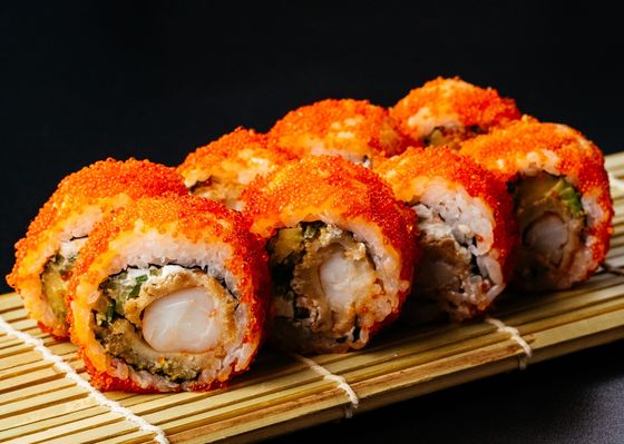 Рис, нори, тигровая креветка в темпуре, огурец, сливочный сыр, икра тобико