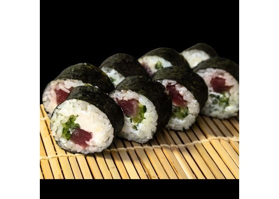 Рис, нори, тунец, сливочный сыр, чука салат, жареный окунь, икра тобико
