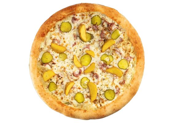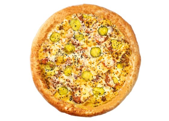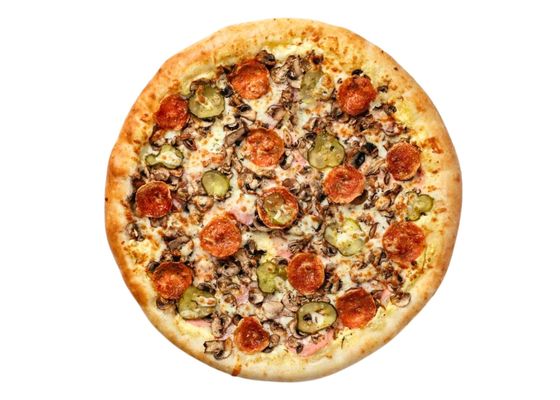 Томатный соус, сыр моцарелла, пепперони, ветчина, грудинка, шампиньоны, маринованные огурцы, смесь итальянских трав