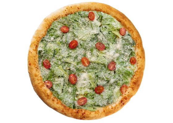 Белый соус, грудинка свиная, цыпленок запеченный, томаты, листья салата, сыр моцарелла, сыр пармезан, соус цезарь, томаты черри, смесь итальянских трав