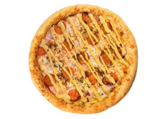 Томатный соус, сыр моцарелла, ветчина, грудинка, пепперони, говяжий фарш (болоньезе), спайси соус, смесь итальянских трав