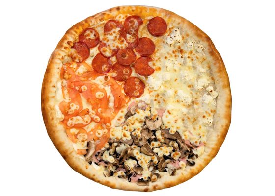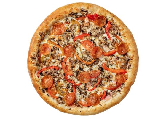 Грибной соус, сыр моцарелла, ветчина, пепперони, сладкий перец, шампиньоны, томаты, смесь итальянских трав