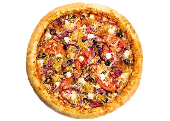 Томатный соус, сыр моцарелла, красный лук, болгарский перец, шампиньоны, маслины, томаты, сыр фета, смесь итальянских трав