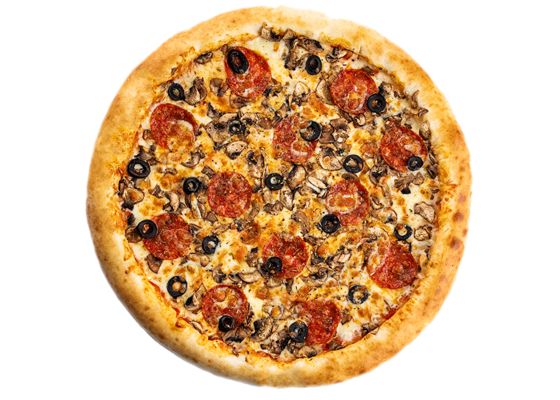 Томатный соус, сыр моцарелла, пепперони, шампиньоны, маслины, смесь итальянских трав