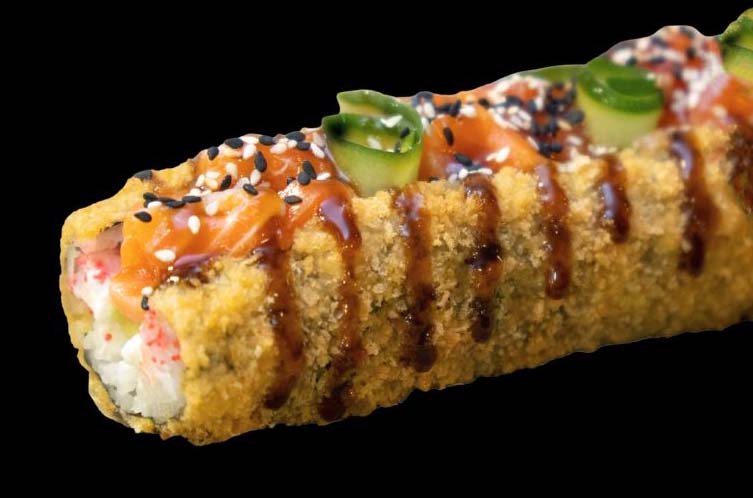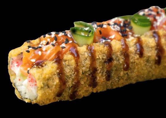 Рис, нори, лосось, авокадо, огурец, сливочный сыр, кляр, икра тобико, соус терияки, кунжутная смесь