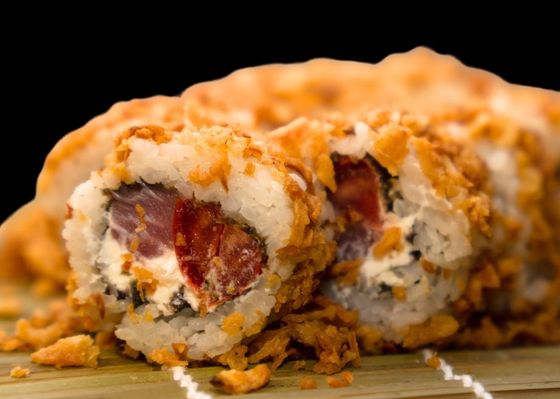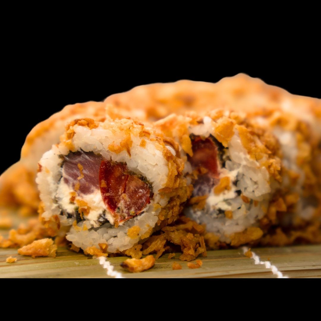 Рис, нори, лосось, авокадо, огурец, сливочный сыр, кляр, икра тобико, соус терияки, кунжутная смесь