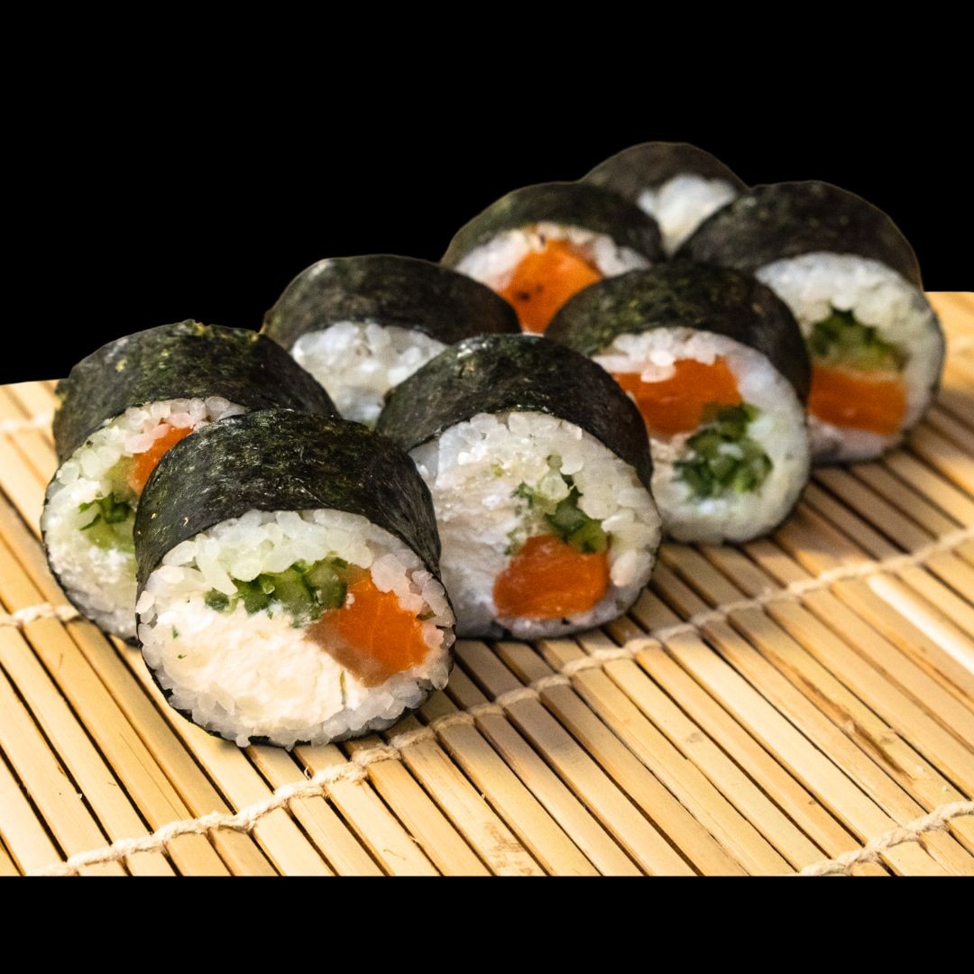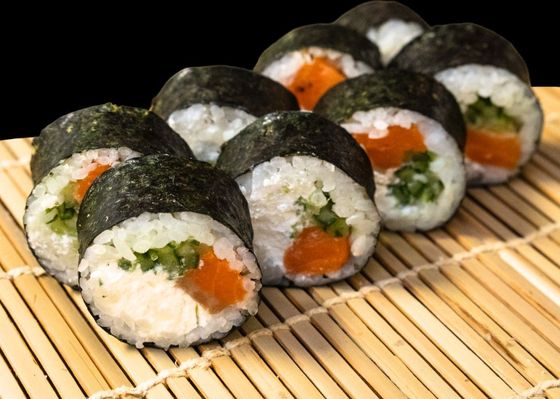 Рис, нори, сливочный сыр, лосось, огурец