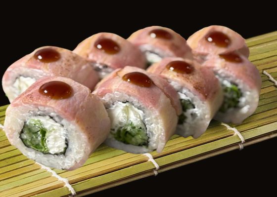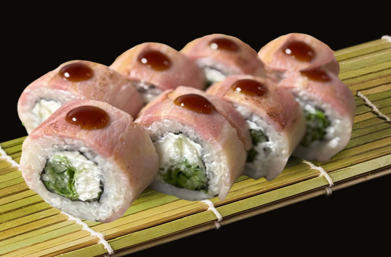 Рис, нори, бекон, салат айсберг, огурец, сливочный сыр, соус терияки