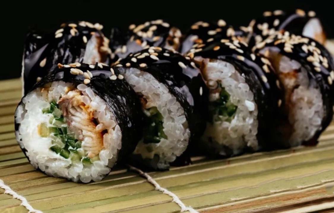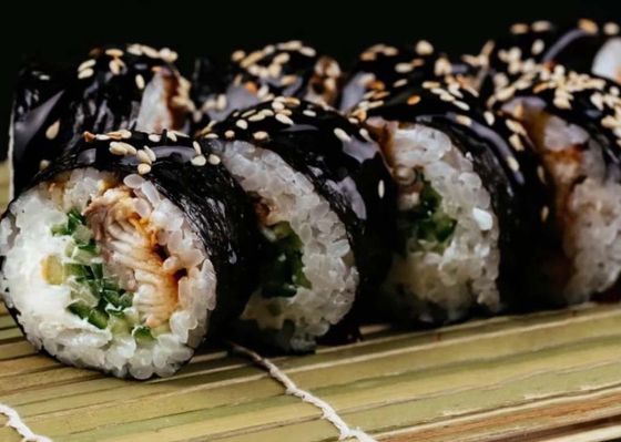 Рис, нори, копченый угорь, огурец, соус унаги, кунжутная смесь