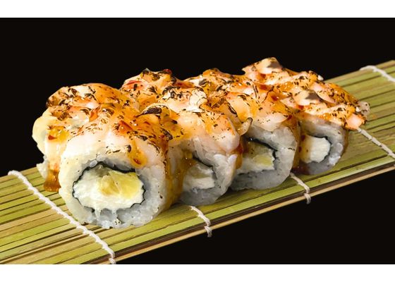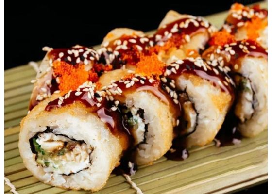 Рис, нори, сливочный сыр, огурец, угорь копченый, кляр, соус унаги, икра тобико, кунжутная смесь