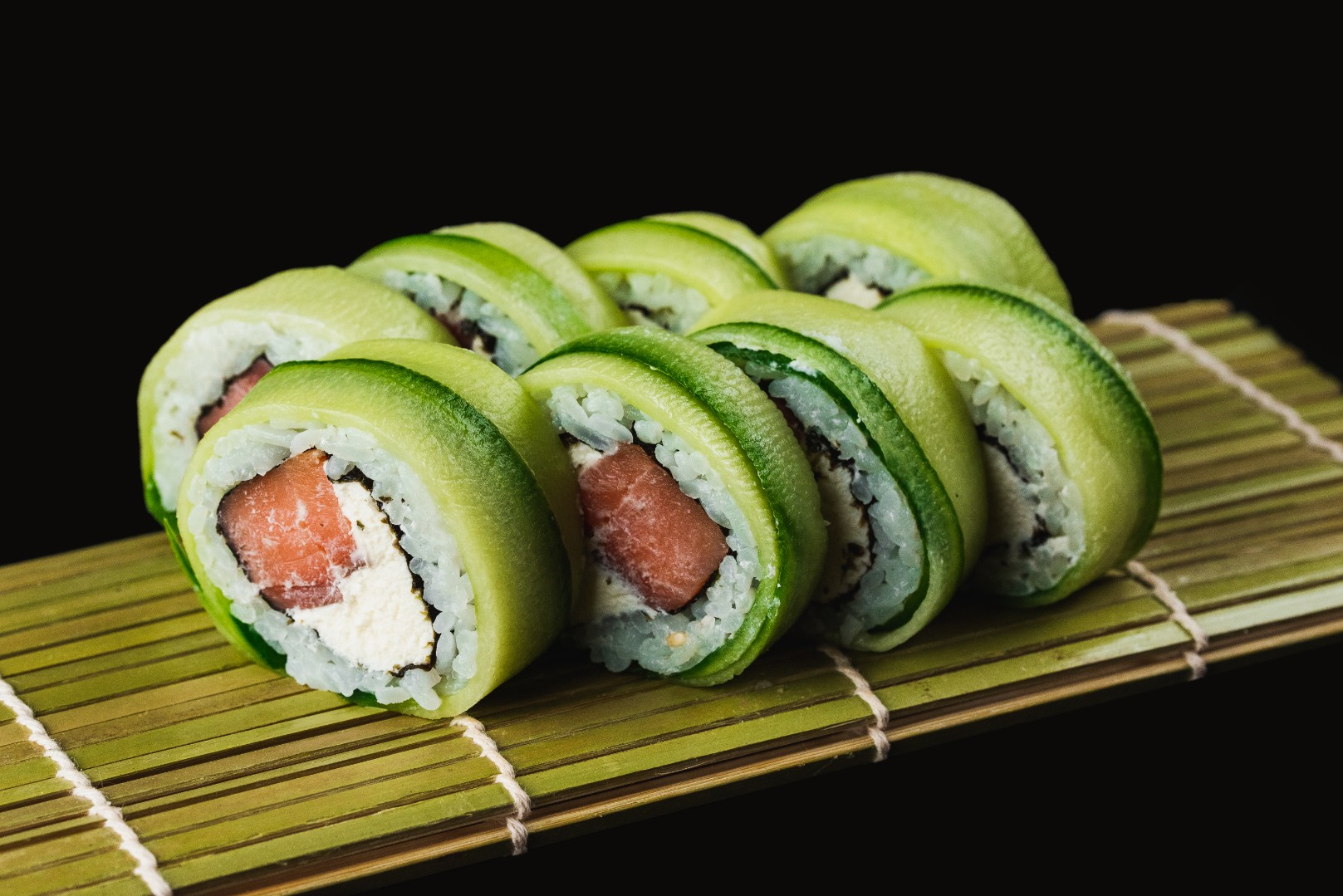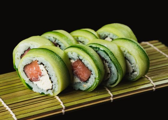 Рис, нори, копченый лосось, сливочный сыр, огурец