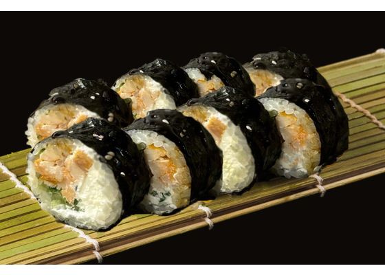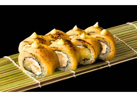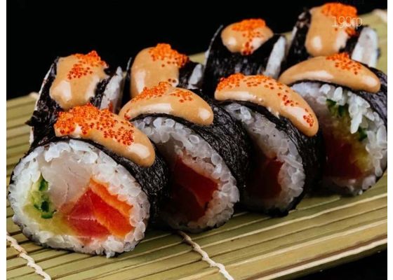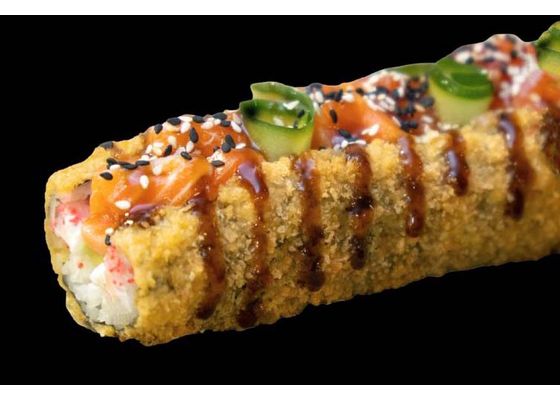 Рис, нори, лосось, авокадо, огурец, сливочный сыр, кляр, икра тобико, соус терияки, кунжутная смесь