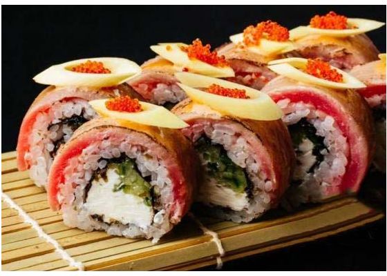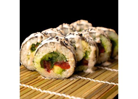 Рис, нори, обожженный тунец, сливочный сыр, огурец, спайси соус, лук-порей, икра тобико