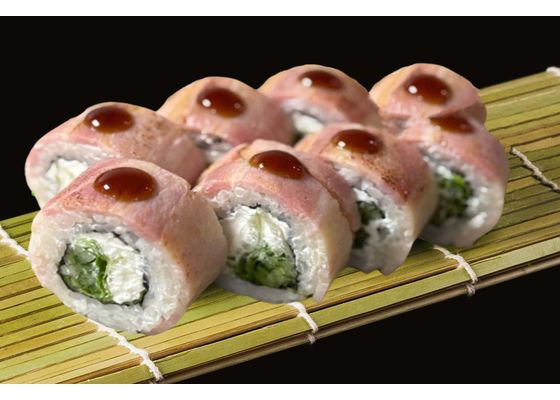 Рис, нори, бекон, салат айсберг, огурец, сливочный сыр, соус терияки
