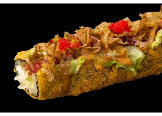Рис, нори, тунец, салат айсберг, кляр, сливочный сыр, кляр, соус джек дениэлс, стружка тунца, икра тобико