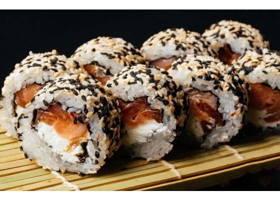 Рис, нори, лосось, сливочный сыр, огурец, соус терияки, икра тобико, кунжутная смесь