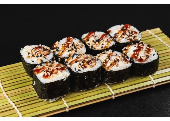 Рис, нори, копченый угорь, сливочный сыр, соус унаги, огурец, кунжутная смесь