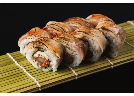 Рис, нори, тигровая креветка в темпуре, сливочный сыр, обожженный окунь, соус кисло-сладкий чили