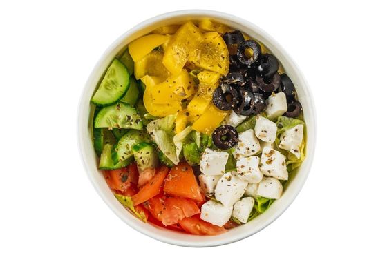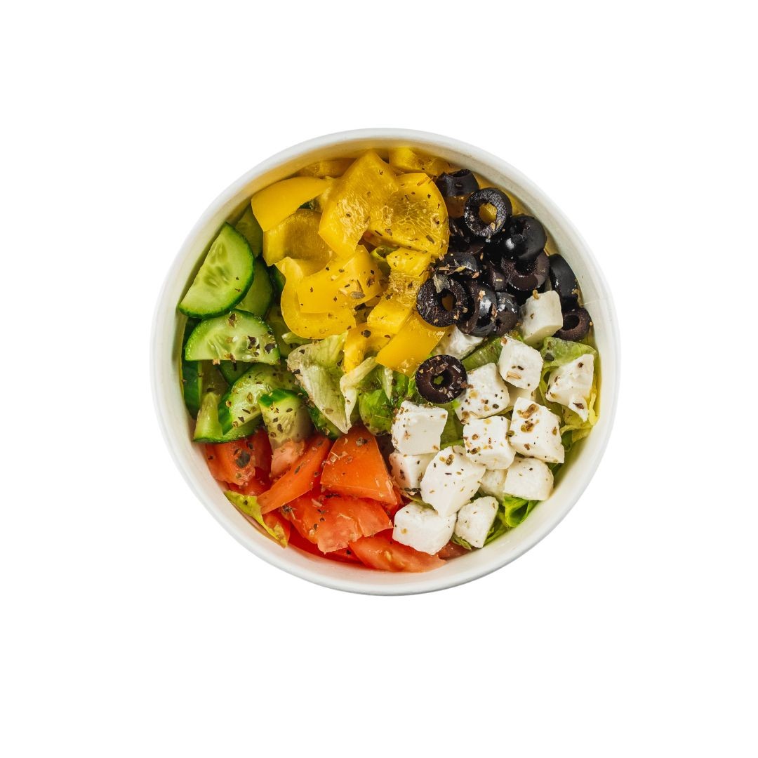 Салат, огурец свежий, томаты, сладкий перец, сыр фета, маслины, масло оливковое, соль, смесь итальянских трав