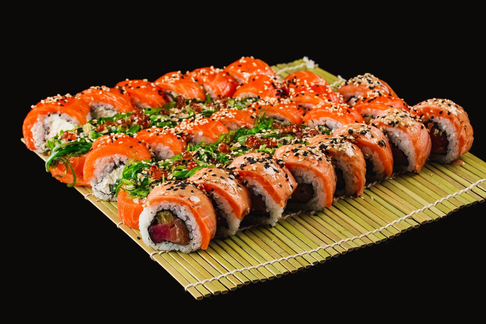 Грин ролл, ролл Фудзи, ролл Бонито, ролл с угрем и огурцом, ролл с лососем и сливочным сыром, ролл Филадельфия Роял (48 штук)