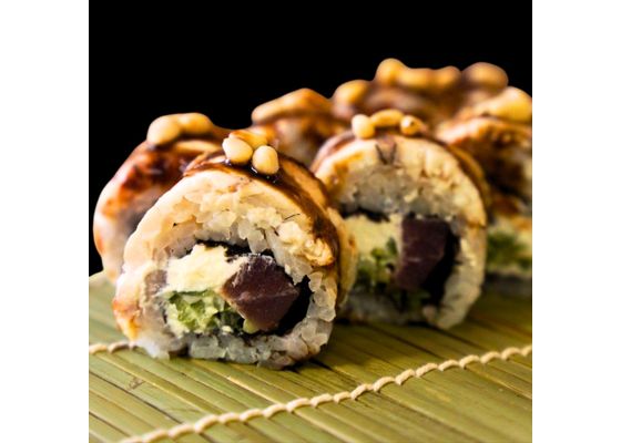 Рис, нори, тунец, сливочный сыр, огурец, угорь копченый, соус унаги, кедровый орех
