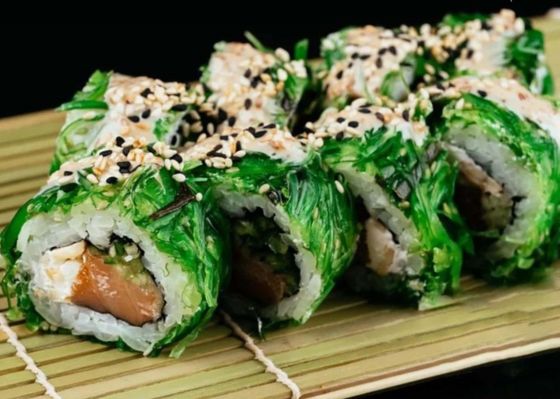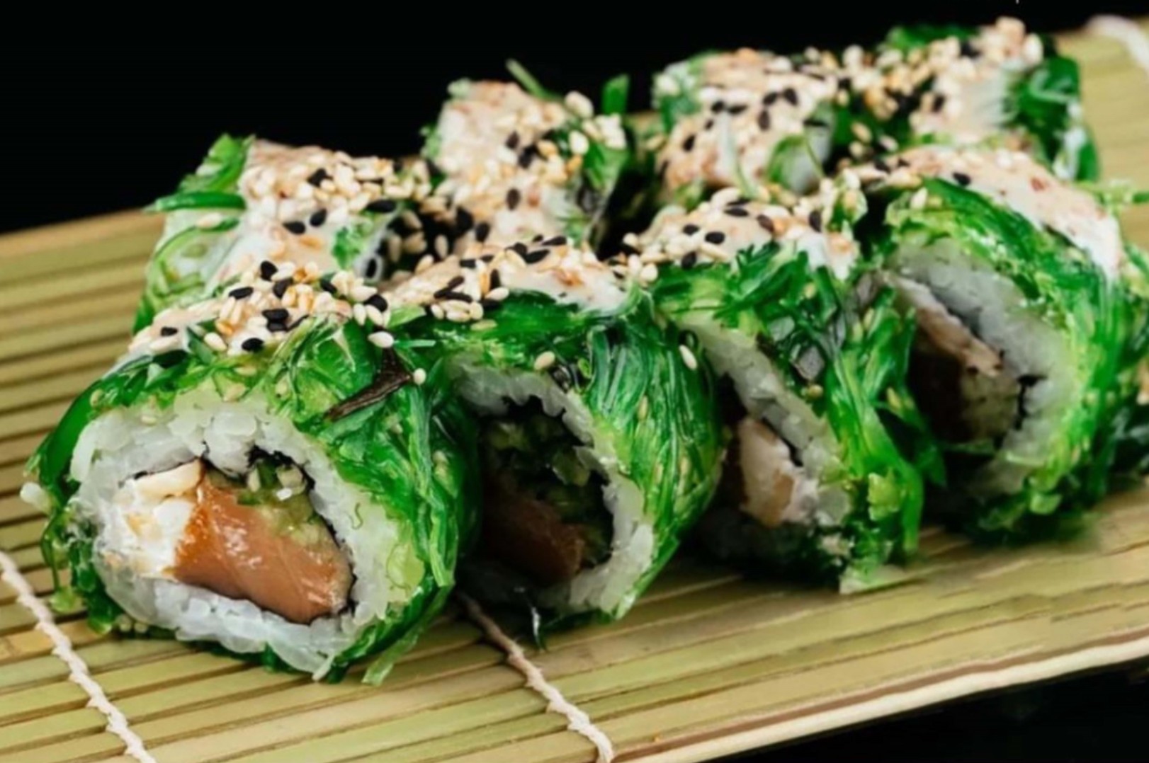 Рис, нори, копченый лосось, сливочный сыр, огурец, кешью, чука салат, ореховый соус, кунжутная смесь